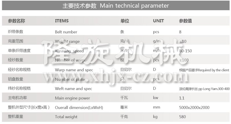 XH8-30型防漏條編織機主要用于編織集裝袋用防漏條、鞋帶、提包帶等。并根據防漏條的特點(diǎn)設計了專(zhuān)用卷繞機。